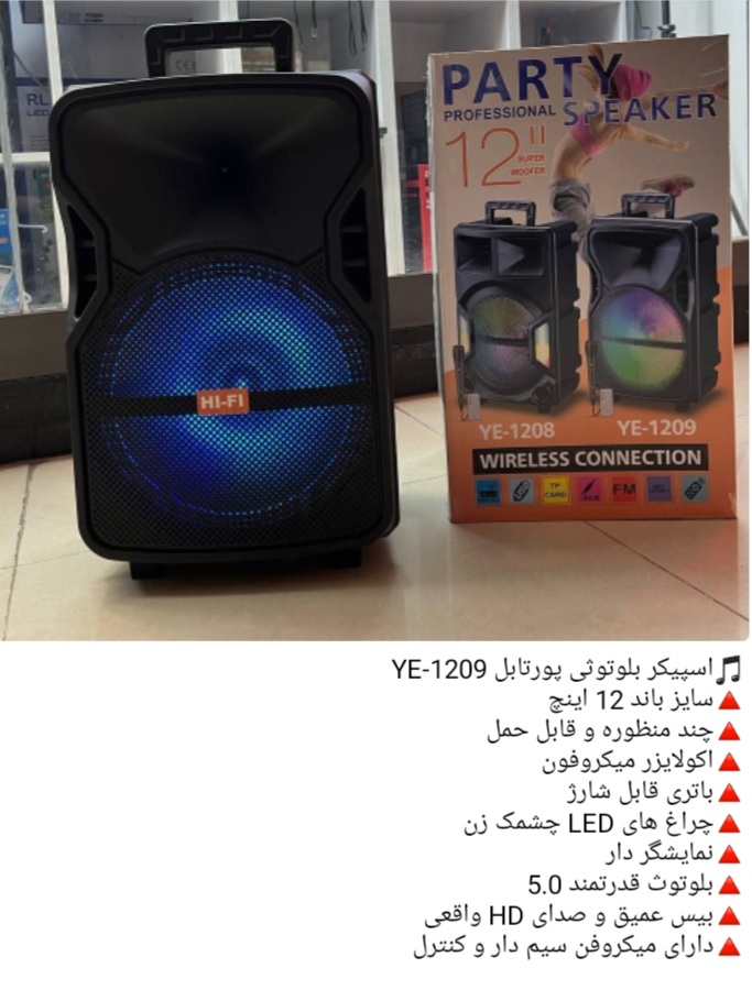 سایز باند 12 اینچ+چند منظوره و قابل حمل+اکولایزر میکروفون+باتری قابل شارژ+چراغ های LED چشمک زن +نمایشگردار +بلوتوث قدرتمند5.0+بیس عمیق و صدای HD واقعی+دارای میکروفون سیم دار و کنترل